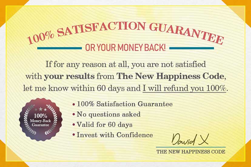 You literally take zero-risk with The New Happiness Code. You have a full 60-day guarantee! If at any point during that 60-day period, you decide it’s not for you, you can return it for a full refund. Every penny. No hassle...not a single question.